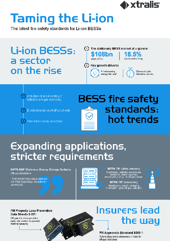Fire safety standards are changing across the Li-ion BESS sector. This infographic gives you a quick, clear snapshot of today’s off-gas detection requirements and guidelines.